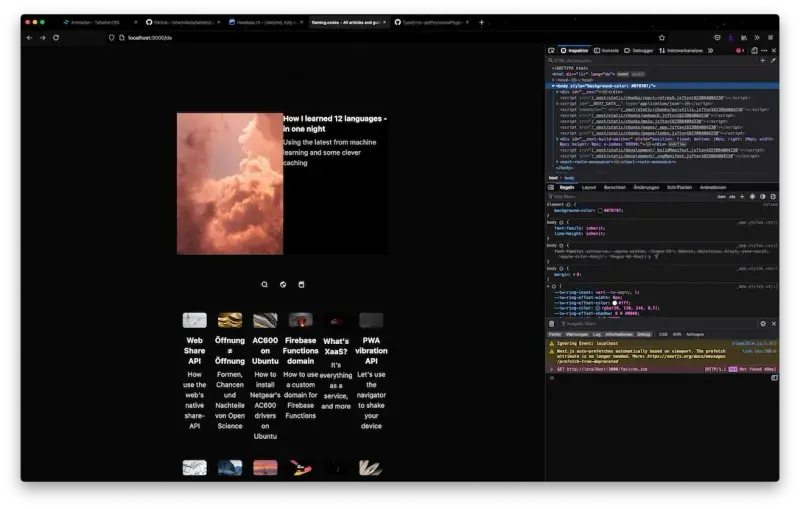Prior to the migration, all sites scored 100 points except for performance, where I reached around 75 to 80 points per measurement. After the migration, I can now report a performance between 90 and 95 points, depending on Vercel’s edge network performance, where the PWA is hosted. Thanks to Tailwind.css, I now nearly reach a perfect score, which is quite impressive considering the site uses quite a lot of styling (even though it seems very minimal) as well as media such as videos and images.